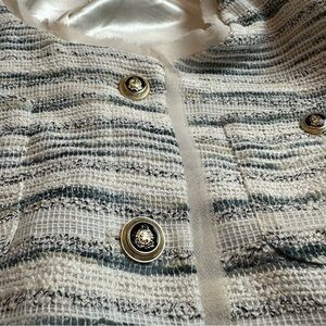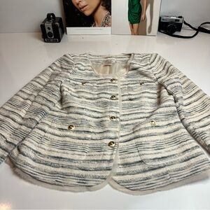 Classic Monroe & Main blazer in a cream and soft gray striped weave with a textured, structured hand. Features a collarless neckline and gold-tone button front for a polished but easy silhouette. This piece sits comfortably in the classic workwear / coastal chic / capsule wardrobe lane and layers well over dresses, blouses, or denim.