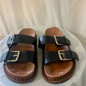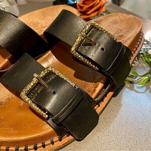 Elegant black sandals , Birkenstock style 2 straps….with striking gold buckles.