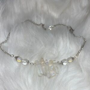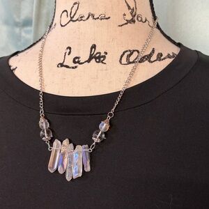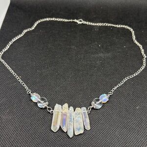 Here I have made for you a simple stainless steel chain necklace with a collection of Aura Quartz chards accented with clear quartz and aura beads. White and clear quartz are the most powerful stones for positive energy on earth. Necklace measure 20” over all.