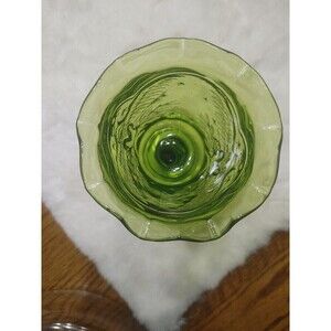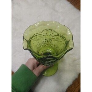 This vintage L.E. Smith goblet features a beautiful green color and an embossed Federal Eagle pattern with stars. The round glass goblet measures 4 inches in diameter and 6.5 inches in height, weighing 15.8 oz. It is made of pressed glass and is a unique piece of American-themed drinkware from the 1960s. Care instructions recommend hand washing only. This collectible item is perfect for those who appreciate historical and unique glassware.