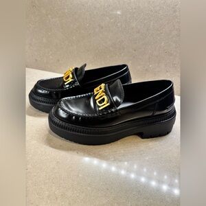 Elegant black loafers with bold gold Fendi logo. Perfect for a sophisticated look.