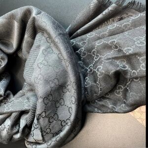 Elegant scarf featuring iconic GG logo. Soft texture with fringe edges.