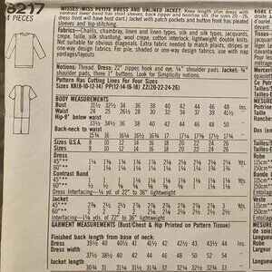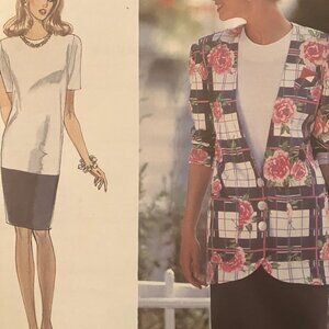 Simplicity 8217 ©1992 Size 20 to 26 Bust 42 to 48 Damon Dress Inc. Misses Dress and Unlined Jacket; Knee length slim dress iwth contrast lower band has short sleeves, back zipper and hemline slit. For sizes 20-26 dress front will have bust dart. Jacket with patch pockets and button front has pleated sleeves and top stitching. Uncut and complete/ FF/ OOP/ Envelope is creased at sides and worn/torn along label and top edge
