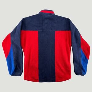 Vintage-inspired Polo Sport Ralph Lauren fleece jacket featuring bold colorblock design in red, navy, and blue.