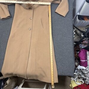 Vintage Marvin Richards long wool coat in classic camel tan with a luxurious genuine fur collar. Stylish full-length silhouette with button front closure and lined interior. Elegant timeless piece great for winter fashion or dress occasions.
