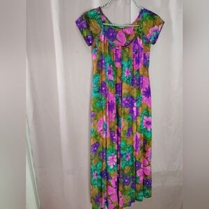 Vibrant floral maxi dress featuring purple and green accents. Perfect for a bold, stylish look. has intact waist tape, tag kimyomi is amazing 🤩 and the back creates the coveted waterfall shape of the 60's. perfect for tiki oasis, VLV viva, pinup photoshoots, and more.