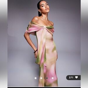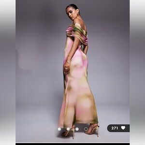Chic off-shoulder maxi dress. Features pink and green tones. Perfect for elegant outings. Color abstract print.