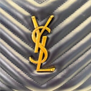 Chic dark blue quilted design. Features iconic YSL logo. Stylish tassel accent