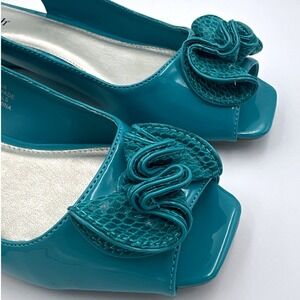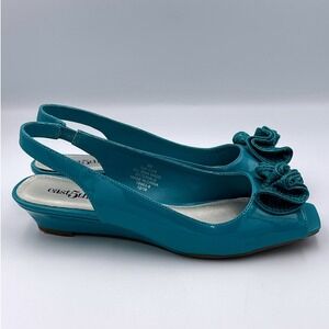 Vintage East 5th Teal Slingback Peep Toe Wedge Floral Bow Heels Women's Size 8M