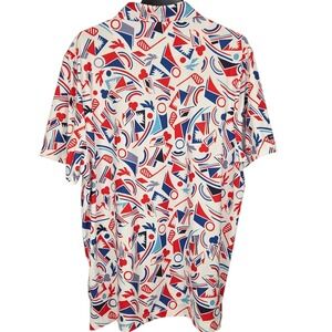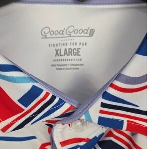 A striking Good Good Golf men's polo shirt in size XLarge, boasting a vibrant patriotic geometric print. This short-sleeved top features a classic polo collar and a comfortable fit, perfect for the golf course or casual outings.