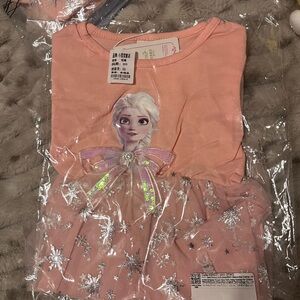 Charming pink dress featuring a silver snowflake pattern, puffy short sleeve and an Elsa graphic. Ideal for festive occasions.