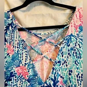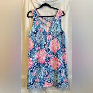 The Kristen Dress has become a Lilly fan favorite for its swing fit and playful lattice V detail at the back. This vibrantly printed sleeveless dress is a "go anywhere, do anything" essential. Super comfortable and easy to throw on for casual or more upscale events.