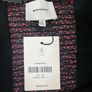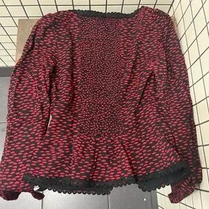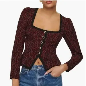 NWT Reformation Nikky Lace Trim Button Long Sleeve Top French Kiss Black Red 2