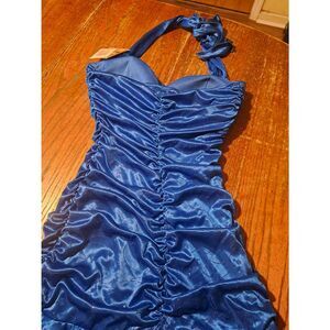 New with tags attached. Womens size small Ruby Rox blue and metallic sleeveless bodycon dress. Features halter neck tie, lightly padded bust, lining, and ruched detailing. Perfect for special occasions including holiday parties, weddings, New Year's, homecoming, prom, cruises, and cocktail events. Style number 1-R-S-R-4-1-6-7-I. Fabric content is 100% polyester.