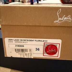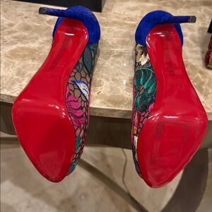 Bold lace design with striking colors. Perfect for a standout look. Signature red sole adds elegance.