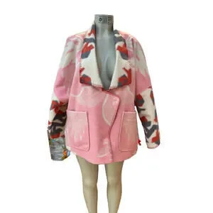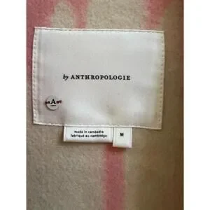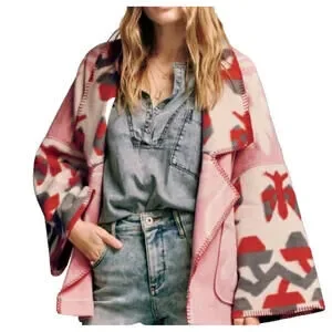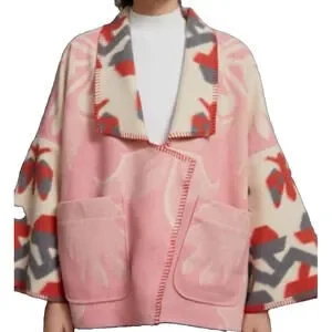 The Anthropologie Heidi Kimono Jacket in Pink, Ivory, and Wine is a stylish and versatile piece perfect for various occasions such as traveling, parties, casual outings, business meetings, and more. Made from a wool poly blend with a modern geo print, this kimono-style jacket features a snap-up closure, soft fuzzy wool accents, and convenient pockets. With a hip length and long sleeves, this jacket is suitable for all seasons and can be easily paired with different outfits for a chic and comfortable look. It is a must-have addition to any woman's wardrobe.