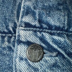 Stylish men's Broken Promises denim jacket in size Large featuring a gray hood. Perfect for a casual look. Brand new unworn condition.