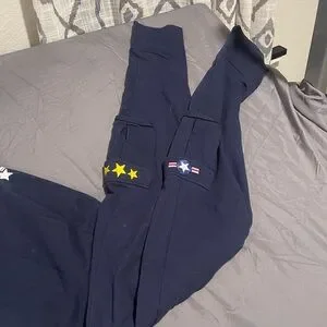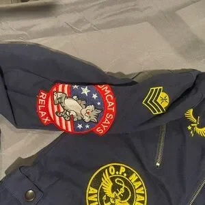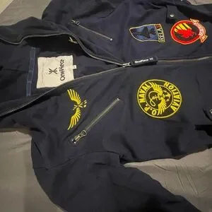 This is the Onepiece Aviator Jumpsuit in navy blue, produced by the Norwegian brand Onepiece. The onesie features several patches and is a popular casual wear item, often associated with a "Top Gun" aesthetic.