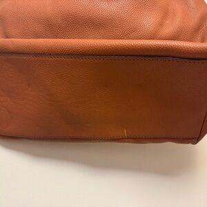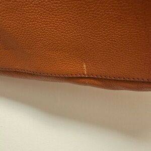 Elegant brown leather shoulder bag. Gold-tone hardware. Spacious and stylish. Light scratches on back of purse and bottom.