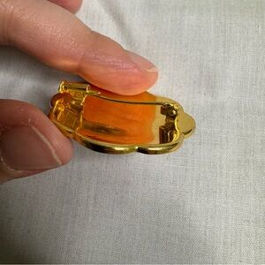 Elegant brooch with intricate floral and bird design. Features black and gold colours.