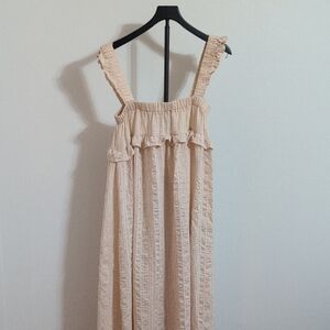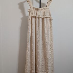 This elegant cream dress features a charming ruffle design, perfect for any occasion. Its soft fabric ensures comfort and style.