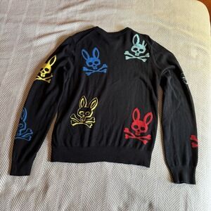 Men's Psycho Bunny Lacomb Sweater with an all over bunny skull and crossbones multicolor print, Size S. Good used condition - no rips, holes, or stains.