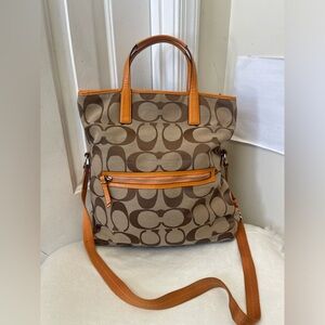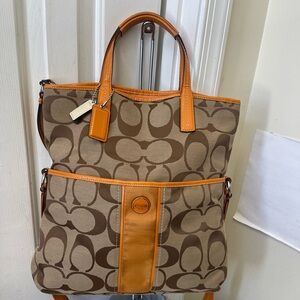 Elevate your style with the Coach Signature Tote Bag. Featuring a chic brown and orange design, this bag is perfect for any occasion. Enjoy the spacious interior and durable construction. . In good used condition, has minimal signs of use. Some marks on the yellow stripe in the front.
