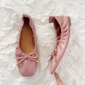 Square Toe Bow Leather Ballet Flat In Pink Magnolia Leather And Gold-Tone Hardware With Bow Accent,
