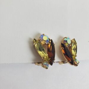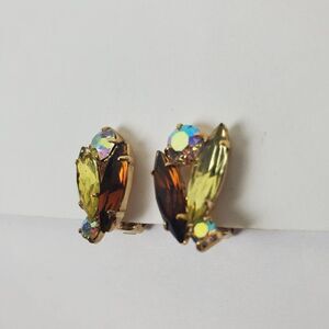 Vintage Brown Topaz Yellow AB Aurora Borealis Navette & Round Prong Set Faceted Crystal Rhinestone Gold Tone Clip On Earrings