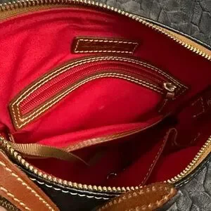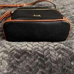 Elegant shoulder bag with a black body and tan trim. Features a zip closure and adjustable strap. Ideal for daily wear. Used. Some scuffs and signs of wear on bag but minimal. Wax black strip on strap is coming off. See pictures. Has a lot of life left.