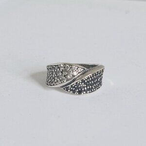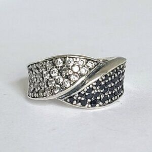 Vintage Boho 2 Tone Clear Black Spinel Crystal Colourblock Sterling Silver Ring
