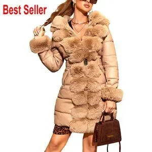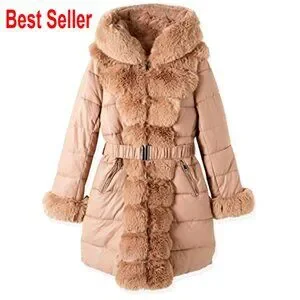 Faux Leather Puffer Jacket with Fur Hood Water-Resistant Belted Coat