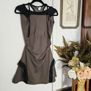 Dress has adjustable skinny shoulder straps with a lacy black off-shoulder overlay. It is ruched at the sides for a super flattering fit, with more black lace at the hips/ thighs. The back has a mesh racerback section with patterning and a Plastik Wrap logo.