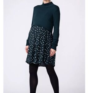 Smart, comfy so easy to wear, our Green Polka Dot 2 in 1 Maternity Nursing Dress is a versatile option for your new mom wardrobe. The polka dot skirt is made in soft woven viscose, designed to skim stylishly over your bump allow plenty of room to grow. Meanwhile the detachable knitted top in a soft cotton blend highlights your empire waist and lifts to reveal secret built-in nursing access – perfect for after baby is born. A seasonal staple, this chic maternity dress works equally well with bare legs sneakers or with black pantyhose boots.