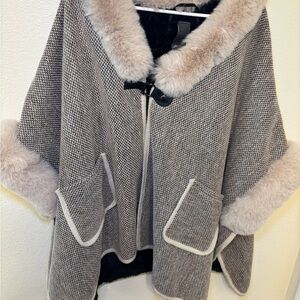 Chic faux fur trim cape. Features taupe and cream hues. Perfect for stylish layering.
