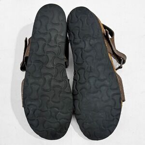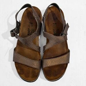 Womens Size 6 (EU 37) Naot Pamela comfort support platform sandals in a metallic bronze with a snake embossed textured leather. These sandals feature a contoured cork footbed for comfort and support, with a stacked platform sole. Adjustable straps with hook and loop closure and rhinestone buckle embellishment.