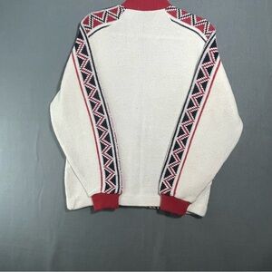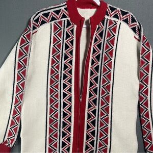 Cozy vintage unbranded sweater featuring a Nordic / Fair Isle geometric pattern. Heavyweight knit with a full zip front, ribbed collar, and cuffs. Substantial feel and quality construction—perfect for colder weather and layering.
