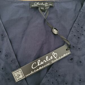 NWT CHARLIE B Sleevesless V-Neck Eyelet Long Navy Midi Tiered Dress S