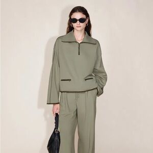 This matching sweatshirt continues the outdoor mood in generous proportions for ultimate comfort. Contrasting suede defines the edges with textural play. Structured ribbed collar keeps your shoulders looking elegant. No wear or tear. Smoke free pet free home.