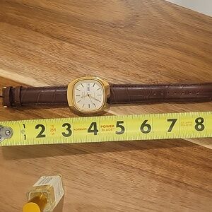 Very unique vintage gold watch with brown leather band. GUB Glashutte Spezichron. Hand wind so manual versus battery operated. It winds up but I have not checked it for accuracy. Leather band is new.