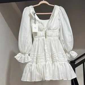 Chic white dress with ruffled details. Features long sleeves and a square neckline.