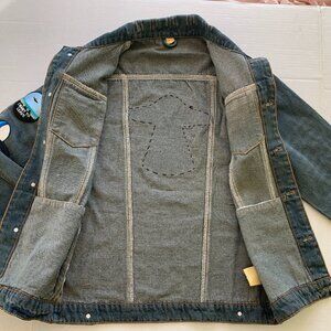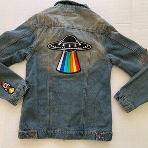 vintage denim jacket, y2k jacket, space jacket, ufo alien jacket, 90s grunge, patched denim, festival jacket, rave style, retro streetwear, cosmic theme, embroidered patches, enamel pins, unisex jacket
