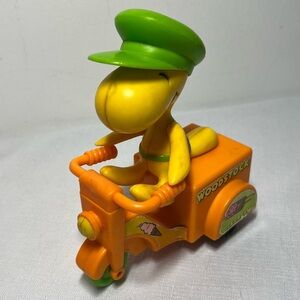 Character: Woodstock, from the Peanuts comic strip, is depicted wearing a green cap and riding an orange three-wheeled scooter with an ice cream cart.