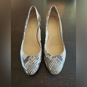 Gently preowned in good condition, Calvin Klein Yana wedge in a snakeskin print. Neutral colors with a bit of pizazz and would be great shoes to wear to the office or out to dinner.
