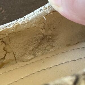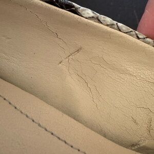 There is some wear and discoloration on the interior, see photos. Where the toe box bends, the lining was cracking and I glued those spots down with shoe glue, which should keep the area stabilized. I don’t see any flaws on the exterior. I think these are vegan leather. 2.5” heel. Listing these heels at a low price due to the cracking on the lining.
