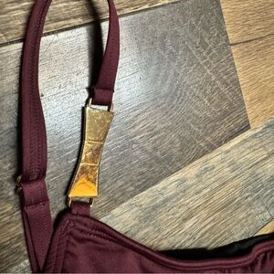 Stylish burgundy one-piece swimsuit by Kate Spade. Features adjustable straps and elegant design. No size tag, but I would say best for medium. Please let me know if I can provide a measurements! There is some where to the gold chrome detailing, but lots of life left