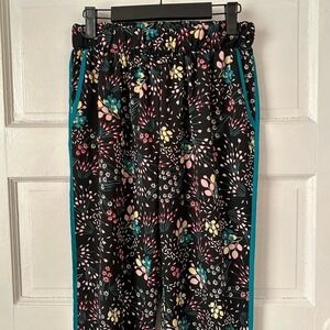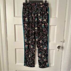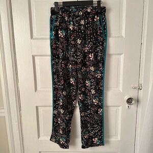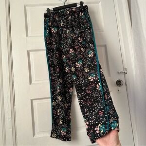 Lulus Boho Blooms Black Floral Pants Teal Trim Pull On Elastic Waist USA Made S