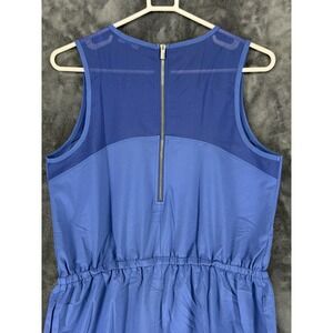 Athleta blue sleeveless dress with mesh yoke detail and a drawstring waist. This dress features a round neckline with a back zipper closure and a flattering silhouette. The combination of the solid fabric and sheer mesh creates a modern and stylish look.