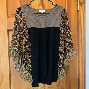 Umgee Women's Floral Mixed Print Black and Brown Waffle Knit Top Size Small