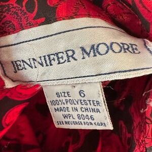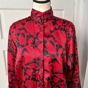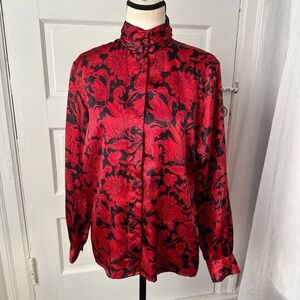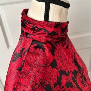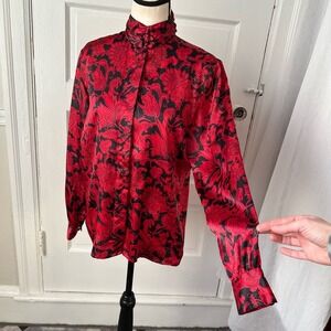 Jennifer Moore Vintage Red Black Baroque Floral Satin Blouse Mock Neck Gothic